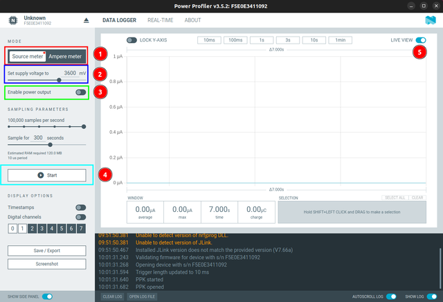 When you click Start to capture data, your PPK2 will start pulsing in color of your mode and you will see measurements in your app.