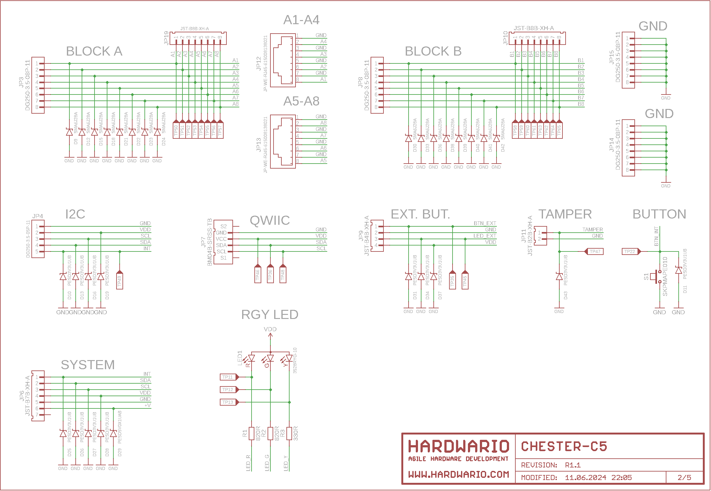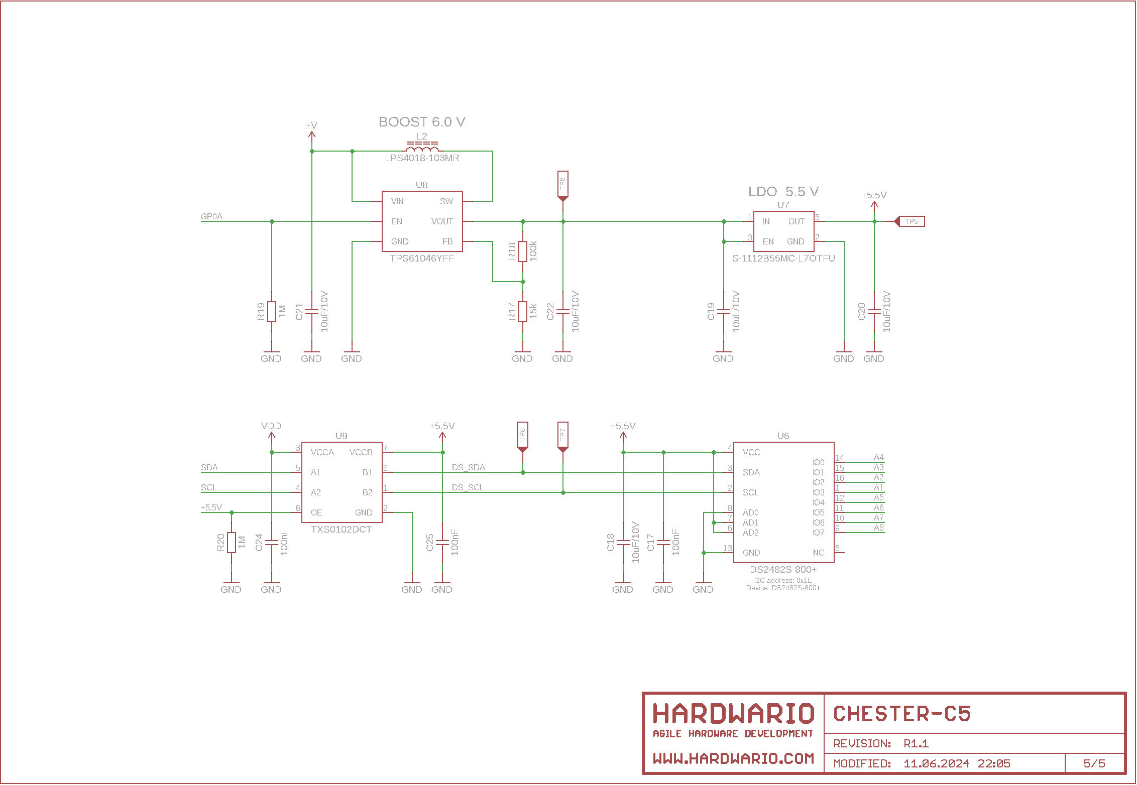 CHESTER-C5 is a custom carrier board for CHESTER-U1 designed as a NB-IoT / LTE-M gateway for connecting arrays of 1-Wire sensors (i.e. DS18B20) equipped with Lithium-Ion battery backup, implements a step-down DC/DC converter providing power from an external 6-28 VDC line (VIN) or 12V solar panel. It allows to measure input DC voltage, QWIIC interface can by used for connecting OLED display.