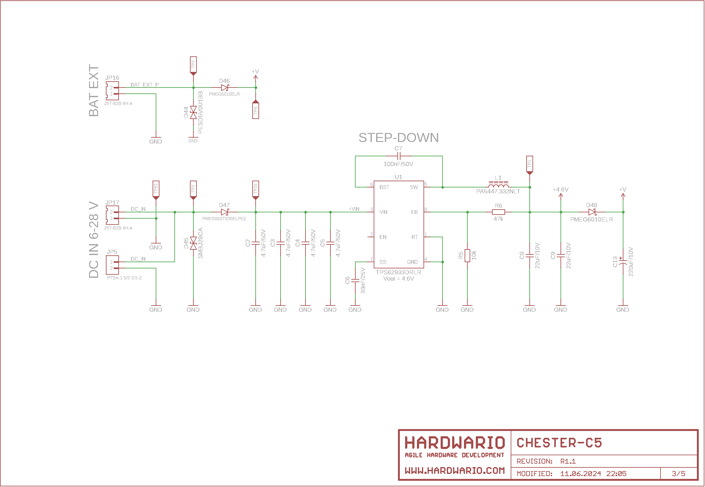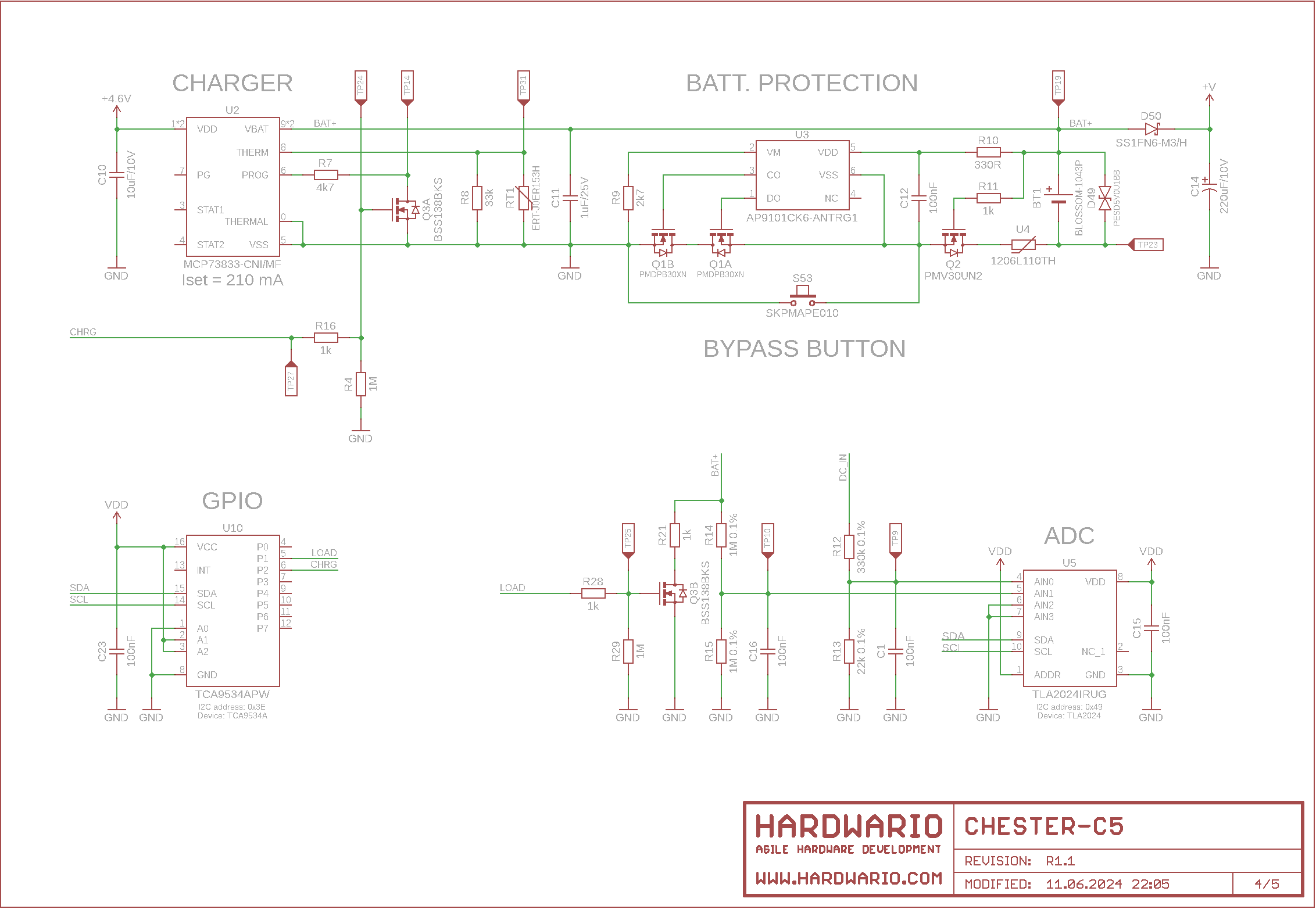 CHESTER-C5 implements the MCP73833 charger IC and the AP9101C protection IC protecting the battery by detecting overcharge voltage, overdischarge voltage, overcharge/discharge current.