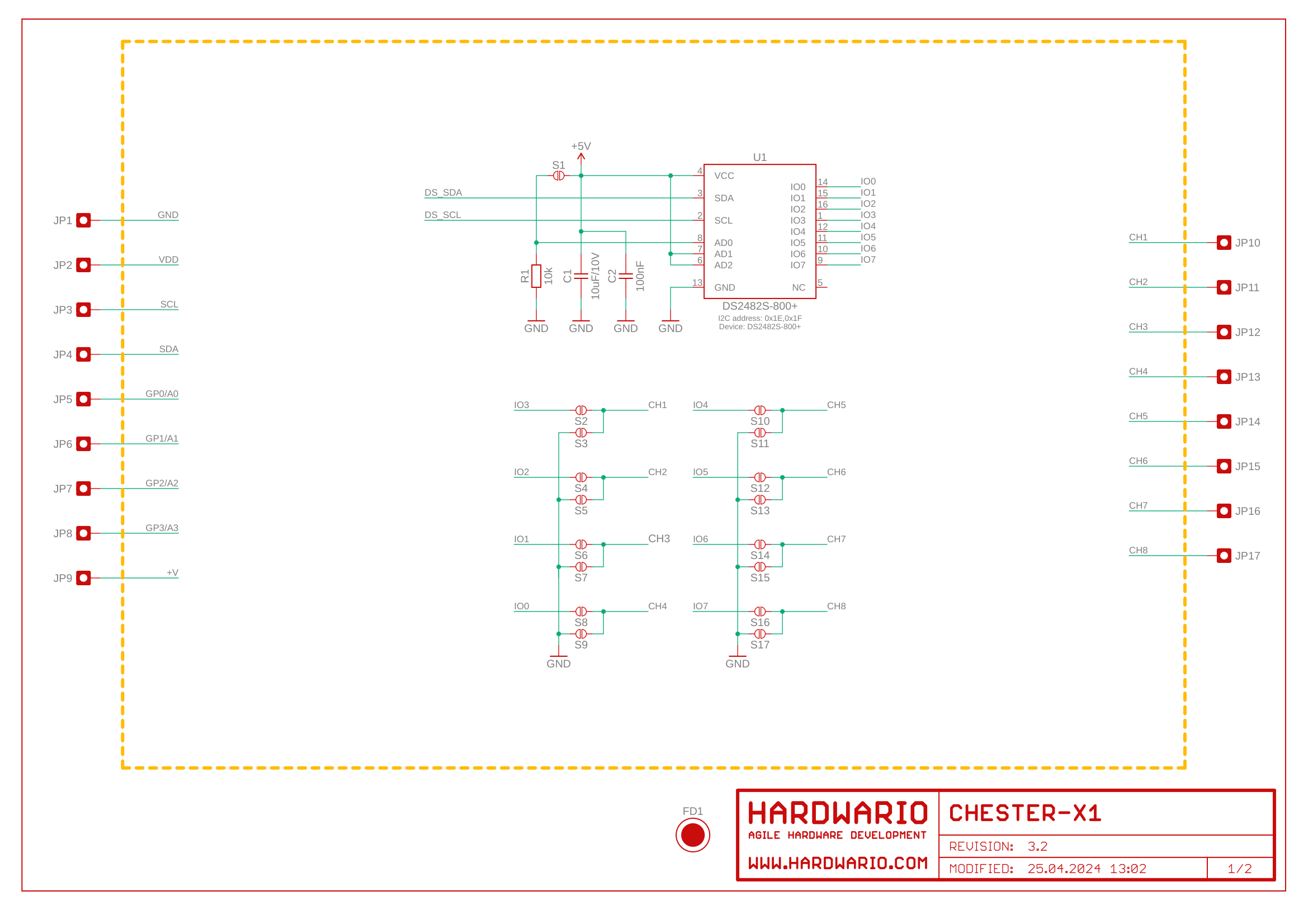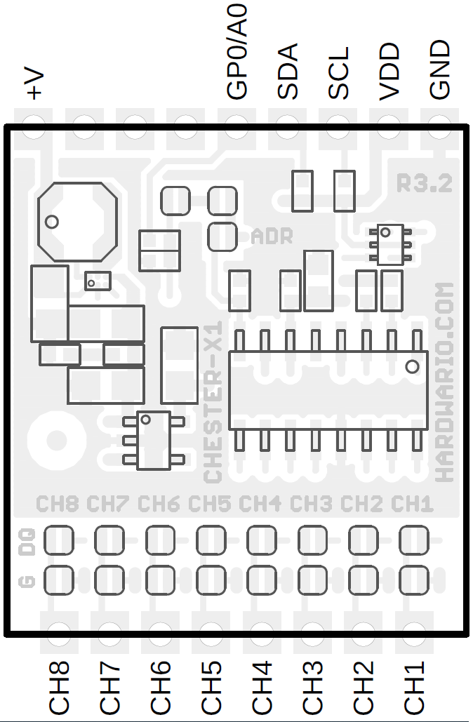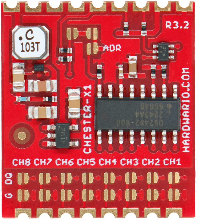 CHESTER-X1 provides 8 independent 1-Wire channels allowing to connect digital sensors ( e.g. Dallas DS18B20) or any other 1-Wire peripheries. The module implements Maxim DS2482S-800+ interface and also 5V boost converter to support 5V 1-Wire peripheries.