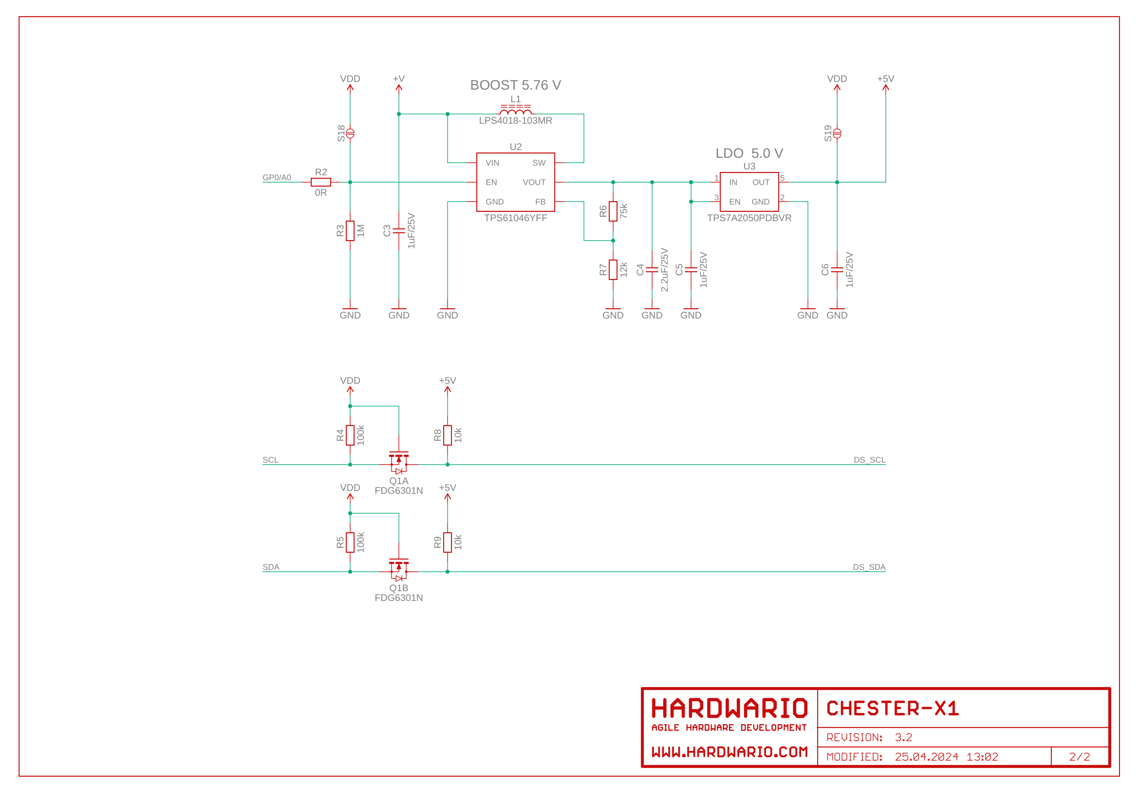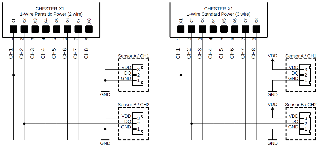 CHESTER-X1 supports connection using parasitic powering method. In that case only 2 wires are necessary. In the parasitic mode 5.0V power supply is used. Standard 3 wire connection powering from VDD supports only 3.0V peripheries. This figure shows parasitic and standard powering method: