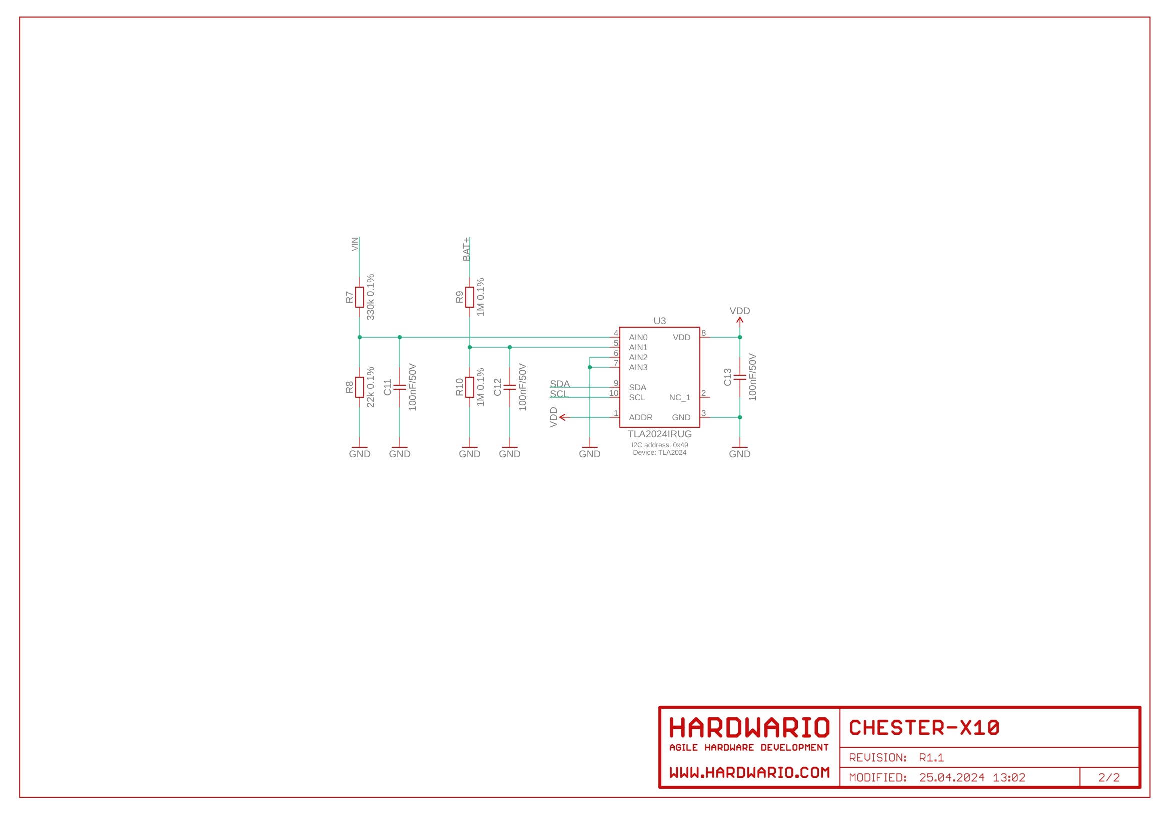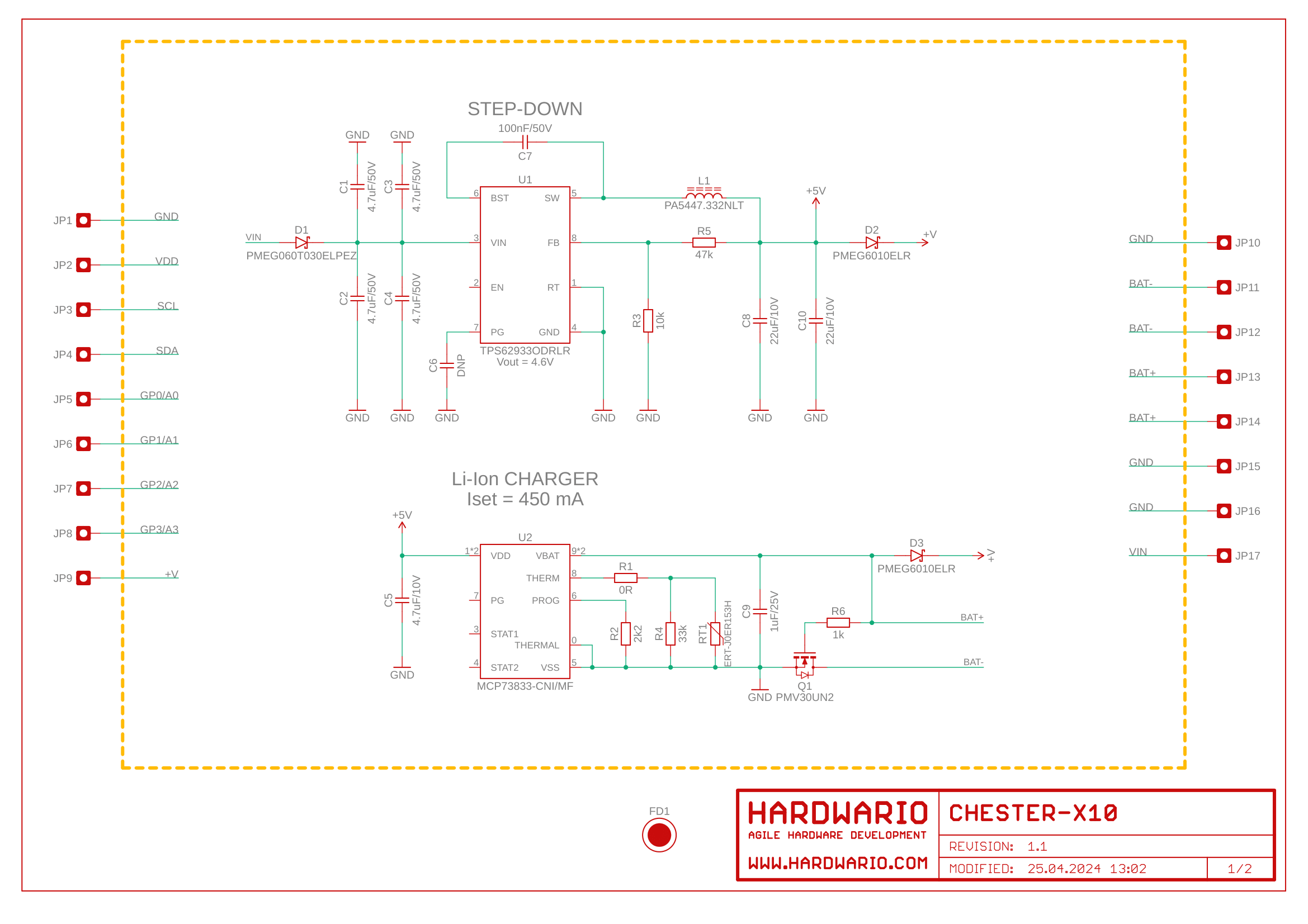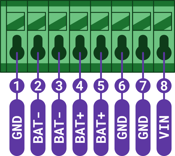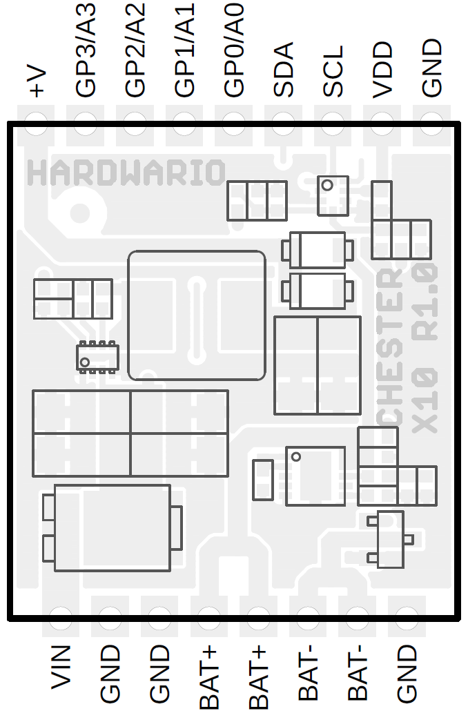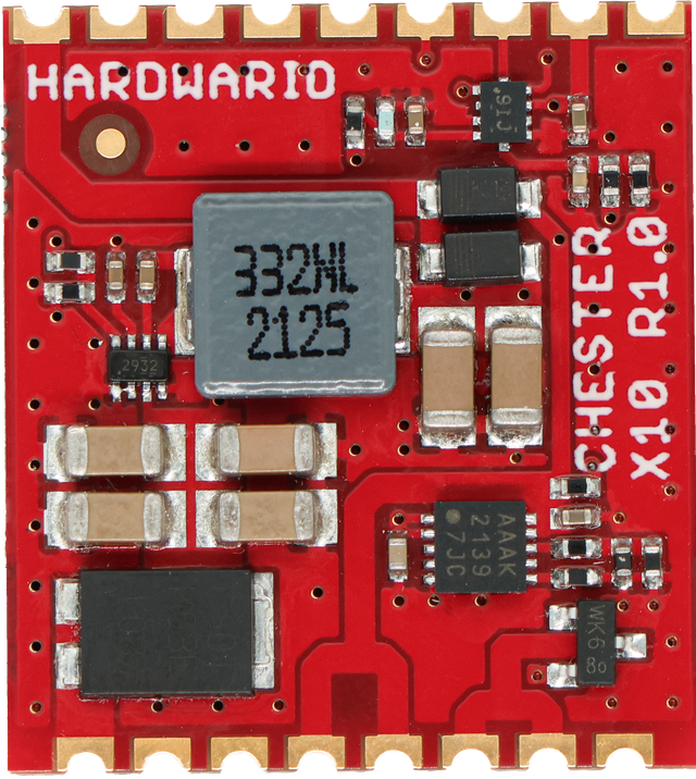 CHESTER-X10 is a backup power supply module for CHESTER. The primary power input is an external 6-28 VDC line (VIN). The module provides also charging the single cell Li-Pol battery. Charging current is set to 450 mA. The module comes with protected single cell Li-Pol battery 3.7V 2000 mAh. Integrated ADC convertor allows to measure the input voltage (VIN / GND) and the battery voltage (BAT+ / BAT-).