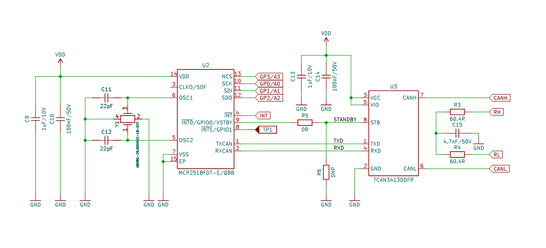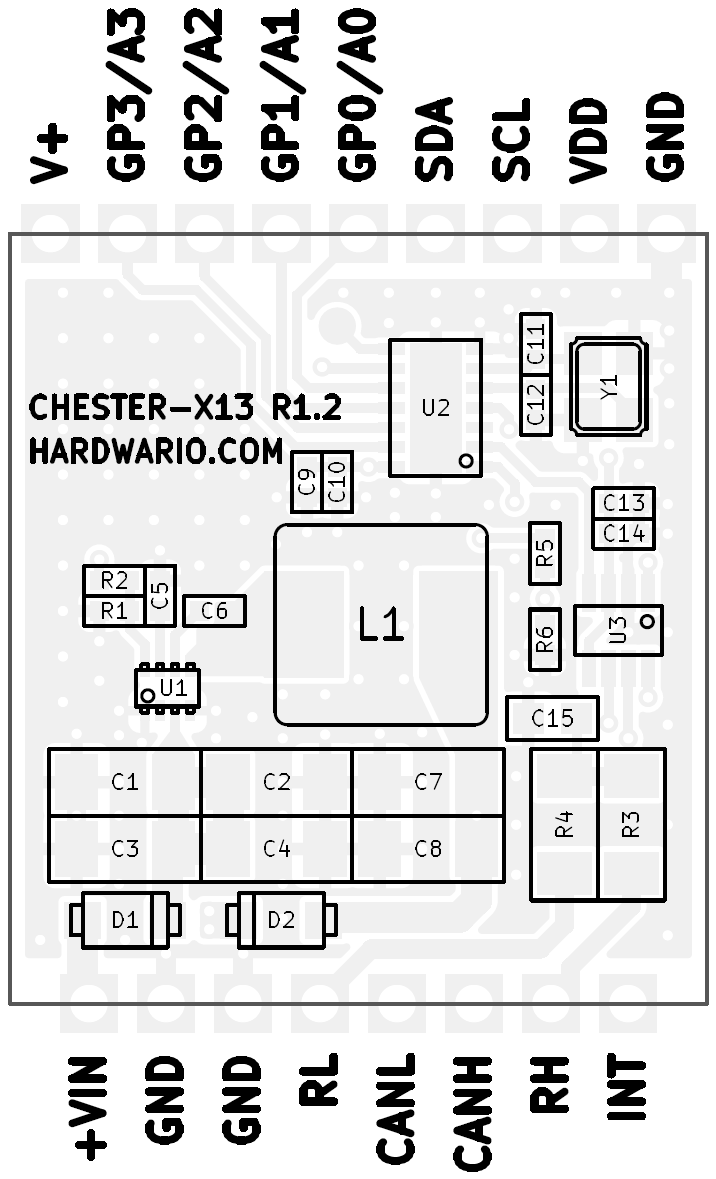 CAN bus is required to be terminated by placing a 120 Ohm resistor between the High and Low lines at both ends of the bus. CHESTER-X13 provides these resistors, but they are disconnected by default (as they aren't needed for a normal CAN node). The terminating resistors can be connected by connecting CANH to RH and CANL to RL (for example using jumpers on the JST connector.