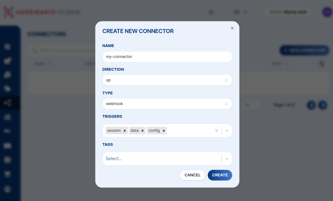 With a connector, you can create a webhook on the messages from the device. Device with the same tag as the connector will trigger single, or multiple connectors.