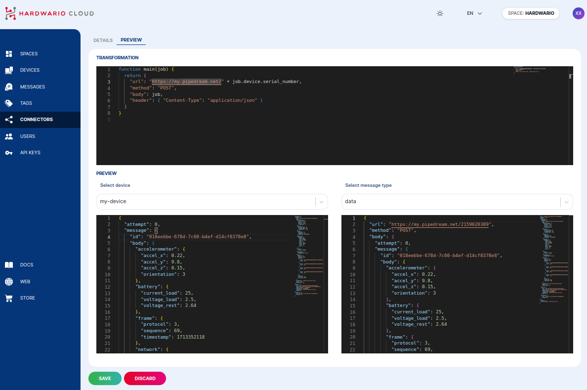 Every message passing through the Cloud is handled by a JavaScript. Users can add further logic or completely reformat JSON which is sent. In script, you can also access all the information from the device like name, tags and labels. You can change HTTP request headers, change URL or completely stop the callback.