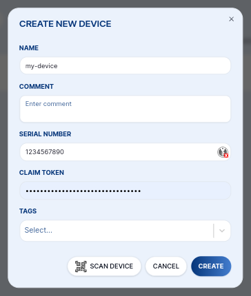 You can use SCAN DEVICE button at the bottom of the CREATE NEW DEVICE dialog and use the phone or computer camera to scan the device QR Code. The HSN and Claim token is filled from the code.