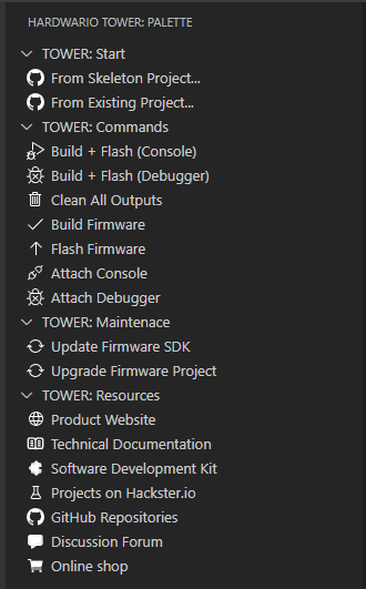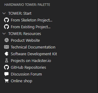 If you didn’t open a folder with HARDWARIO TOWER firmware the extension will activate but will provide fewer options.