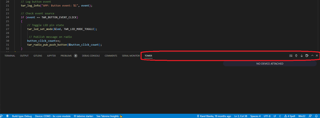 For logging with the HARDWARIO Code there is an available tab in the bottom panel.